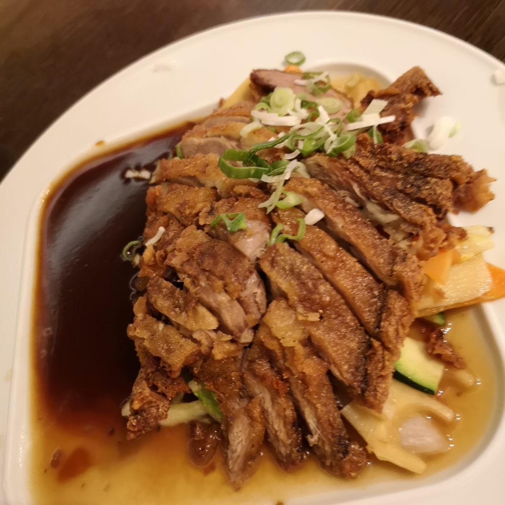 We had crunchy tofu with vegetables. This dish was so neutral it could be served in any hospital. Fried noodles were oily. The only yummy dish was the typical German-Chinese crispy fried duck in a tasty sauce with a few vegetables.