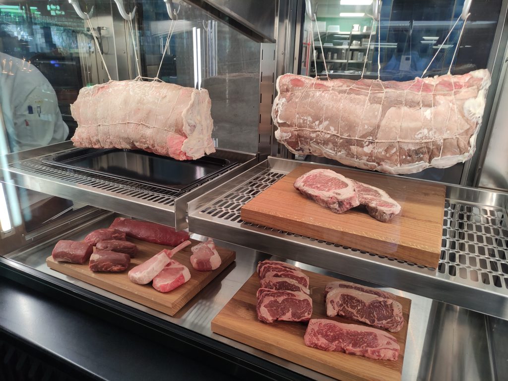 And now came the main product of the restaurant THE CORD: Excellent steaks, from 28 € to 99 €. They were accompanied by exceptionally good side dishes: 1 x green asparagus (6,50), 2 x broccoli (6,50 each), thick steak frites (4,50), remarkable red wine jus (5,50) and perfect Bernaise sauce (4,50). The steaks were like a very good US steakhouse, the sides often much better. Steak lovers will have their joy here.