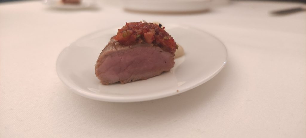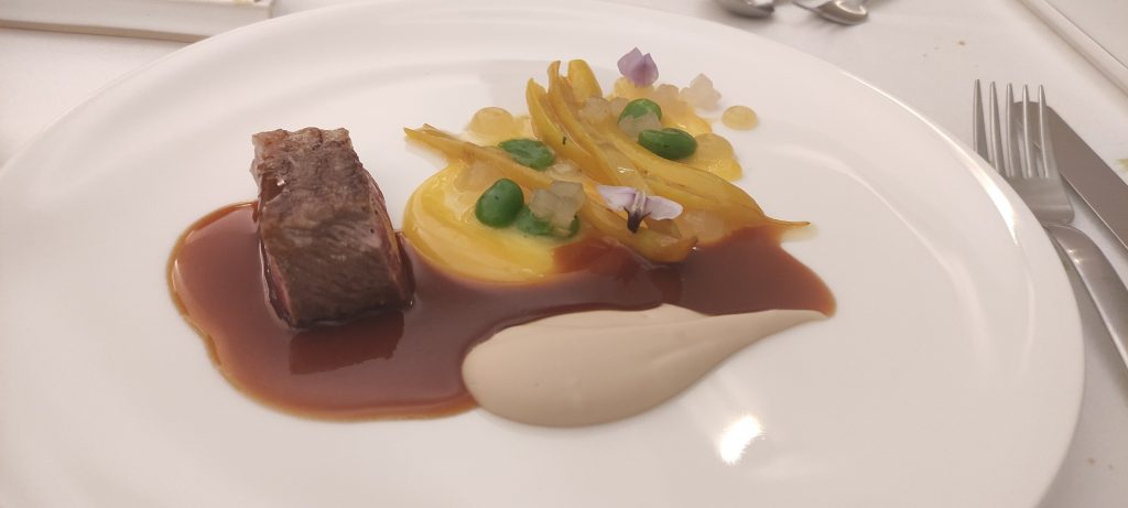 Now the meat course was already coming on two plates, that is, one plate plus a small plate. The saddle of lamb melted in our mouths, it was so tender. We agreed with my son’s opinion: We would have two more pieces of that. The filet on the extra plate was a small bite.