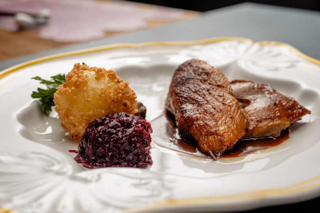 The menu includes a warming celeriac soup with duck ham and nuts, followed by oven-roasted duck with braised red cabbage, potato dumplings, and marjoram jus. For dessert, guests will enjoy a modern take on Bienenstich cake with passion fruit. The menu is accompanied by premium wines from German estates Dreissigacker and Dautel. The price of €132.50 per person includes wine pairing, water, coffee, and the elevator ride to the top. Online booking is available from October 24 (tv-turm.de/sphere-tim-raue).