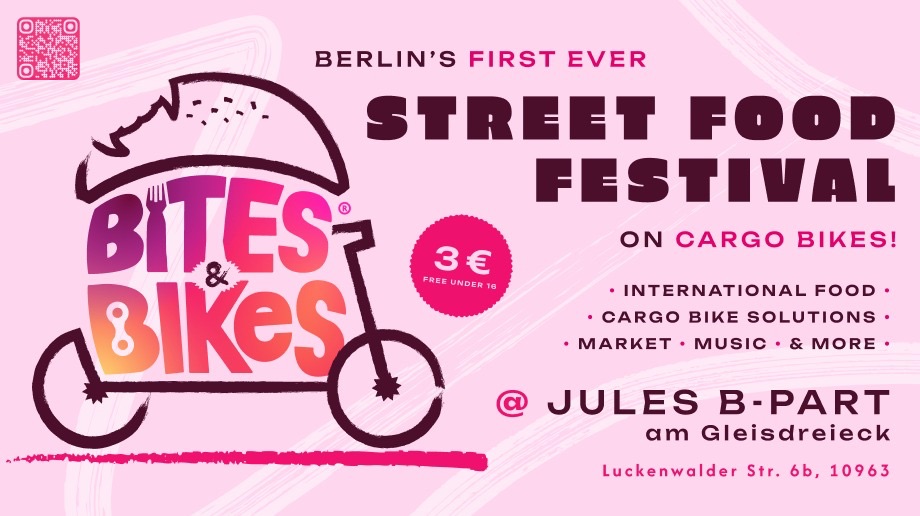 A new urban street food festival is arriving in Berlin-Wedding. Bites & Bikes combines international street food with sustainable cargo bike culture at Jules B-Part (Luckenwalder Str. 6B).